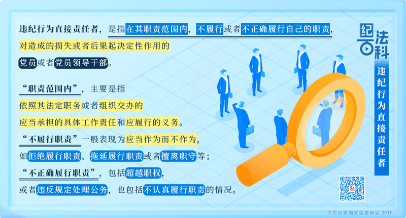 違紀行為直接責(zé)任者,是指在其職責(zé)范圍內(nèi),不履行或者不正確履行自己的職責(zé),對造成的損失或者后果起決定性作用的黨員或者黨員領(lǐng)導(dǎo)干部。