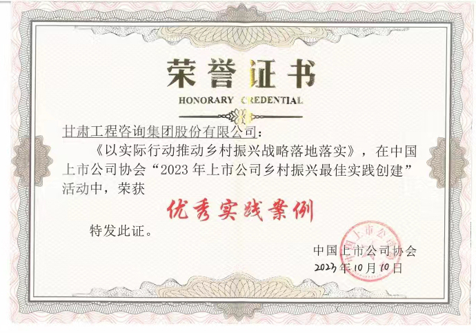 近日,在中國上市公司協會主辦的上市公司鄉村振興經驗交流會暨最佳實踐案例發布會上,由甘肅工程咨詢集團申報的鄉村振興實施案例榮獲“優秀實踐案例”。
