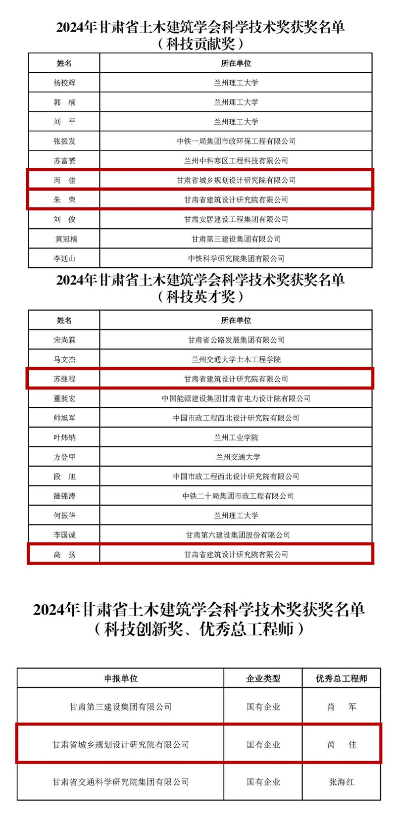 近日,2024年甘肅省土木建筑學會科學技術獎獲獎結果公布,甘肅工程咨詢集團斬獲多項榮譽。其中,省建筑設計院申報的《咬合樁技術在深大基坑中的創新與應用》項目榮獲“科學技術獎(勘測科研組)二等獎”,省城鄉規劃院申報的《城市區域地震災害模擬及規劃研發平臺建設》項目榮獲“科學技術獎(綜合組)二等獎”,土木工程院參與的《寒區水工混凝土抗沖磨技術的開發與應用》項目榮獲“科學技術獎(勘測科研組)三等獎”。省建筑設計院、省城鄉規劃院4人分別榮獲“科技貢獻獎”“科技英才獎”“科技貢獻獎”“優秀總工程師獎”等榮譽稱號。