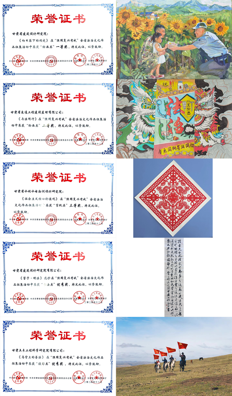 經(jīng)評(píng)選,集團(tuán)多件作品脫穎而出。省建筑設(shè)計(jì)院的《向日葵下的約定》以細(xì)膩筆觸和獨(dú)特視角,獲繪畫(huà)類一等獎(jiǎng);省交通監(jiān)理公司的《與法同行》生動(dòng)展現(xiàn)法治守護(hù),獲繪畫(huà)類二等獎(jiǎng);省水電設(shè)計(jì)院的《社會(huì)主義核心價(jià)值觀》以精湛剪紙技藝,獲剪紙類三等獎(jiǎng);省建筑設(shè)計(jì)院的《〈管子·明法〉選抄》獲書(shū)法類優(yōu)秀獎(jiǎng);甘肅土木工程院的《馬背上的普法》獲攝影類優(yōu)秀獎(jiǎng)。