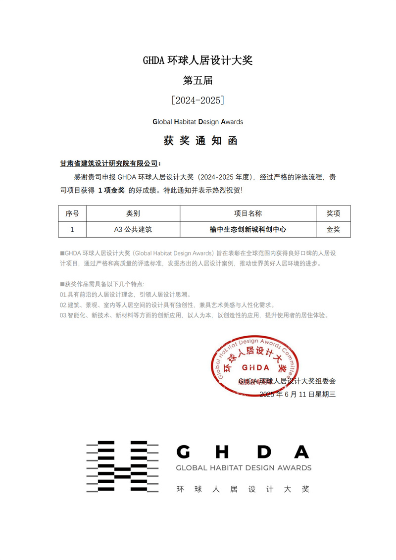 近日,備受矚目的第五屆GHDA環球人居設計大獎獲獎名單揭曉。甘肅工程咨詢集團旗下省建筑設計院精心打造的榆中生態創新城科創中心項目,繼榮獲美國綠色建筑委員會頒發的LEED V4 BD+C鉑金級預認證、中國綠色建筑三星級預評價兩項權威認證后,再度摘得公共建筑類金獎,彰顯出我省在人居設計領域的卓越實力。