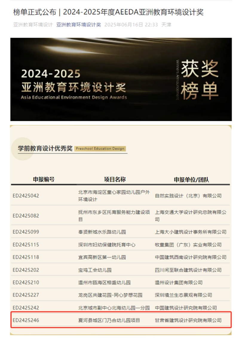 近日,備受矚目的2024-2025年度AEEDA亞洲教育環(huán)境設(shè)計獎(Asia Educational Environment Design Awards)獲獎名單正式揭曉。由甘肅工程咨詢集團(tuán)旗下省建筑設(shè)計院設(shè)計的夏河縣城區(qū)門乃合幼兒園項目,從百余件參賽作品中脫穎而出,榮膺學(xué)前教育設(shè)計領(lǐng)域優(yōu)秀獎,為甘肅建筑設(shè)計行業(yè)贏得了國際聲譽(yù)。