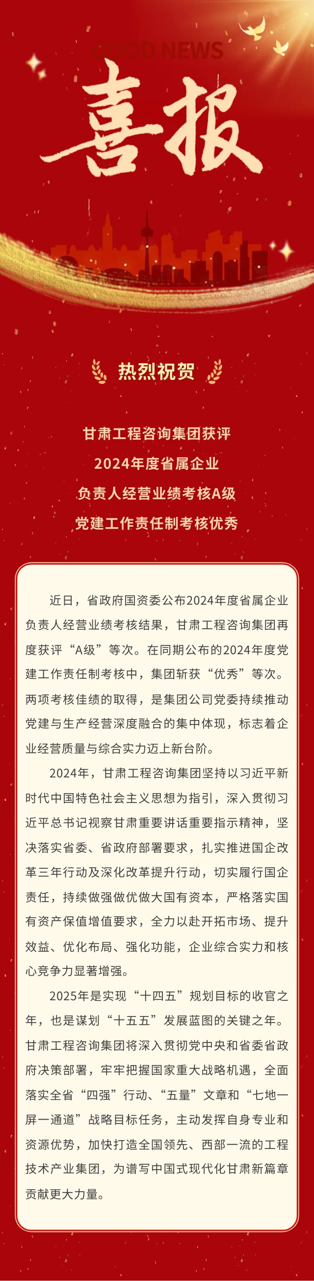 喜報 | 甘肅工程咨詢集團榮獲2024年度省屬企業(yè)考核“雙優(yōu)”佳績:經(jīng)營業(yè)績考核A級、黨建工作責(zé)任制考核優(yōu)秀