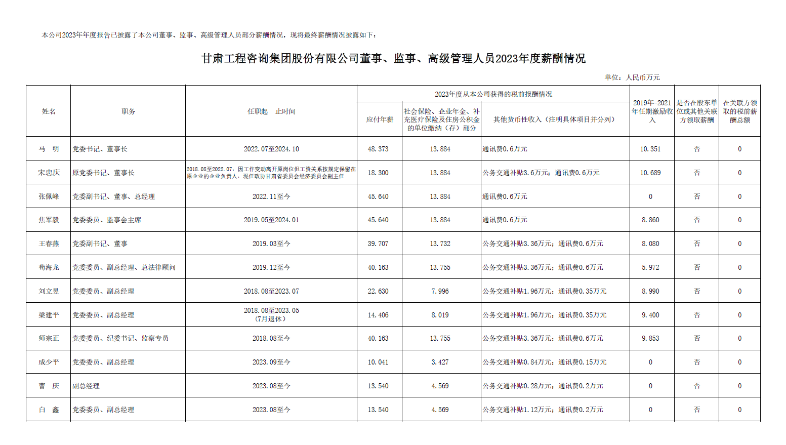 甘肅工程咨詢集團股份有限公司董事、監事、高級管理人員2023年度薪酬情況及甘肅工程咨詢集團股份有限公司工資分配情況