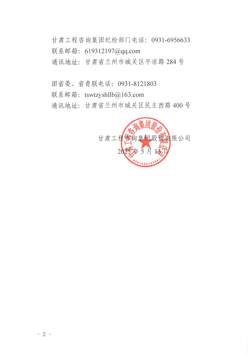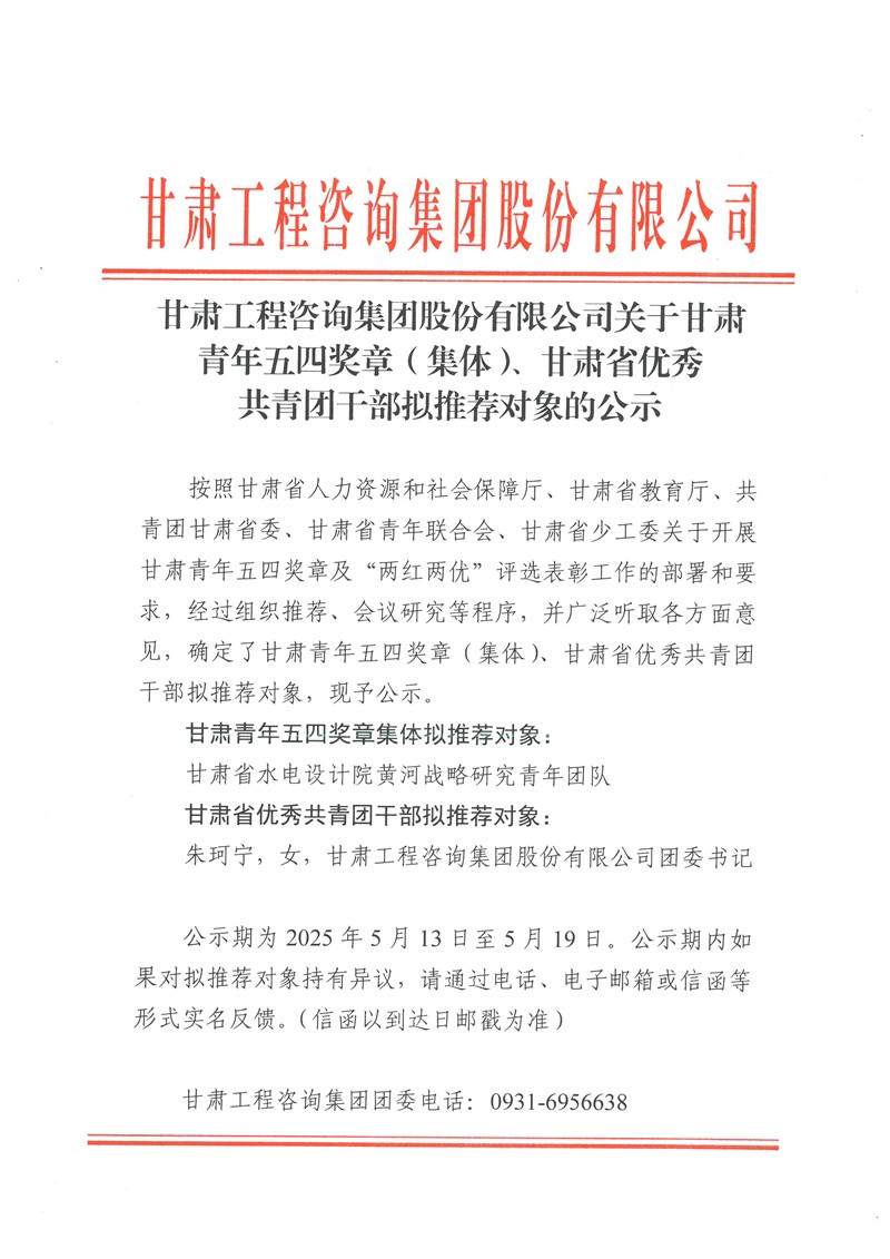 甘肅工程咨詢(xún)集團(tuán)股份有限公司關(guān)于甘肅青年五四獎(jiǎng)?wù)拢w)、甘肅省優(yōu)秀共青團(tuán)干部擬推薦對(duì)象的公示