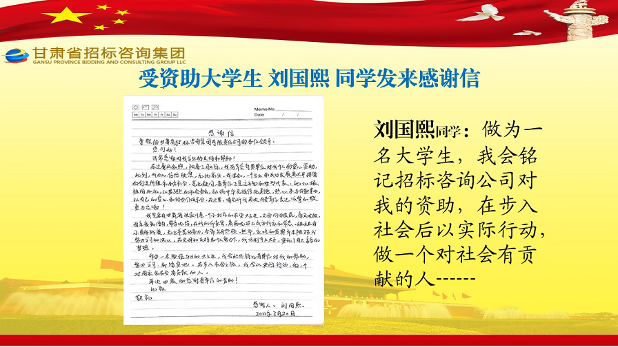 近日,張家川縣張棉驛鄉(xiāng)張棉村貧困大學生代表劉國熙、周長斌、李雪峰等向甘肅省招標咨詢集團有限責任公司發(fā)來感謝信,就招標咨詢集團給予學費資助一事表達他們的感激之情。