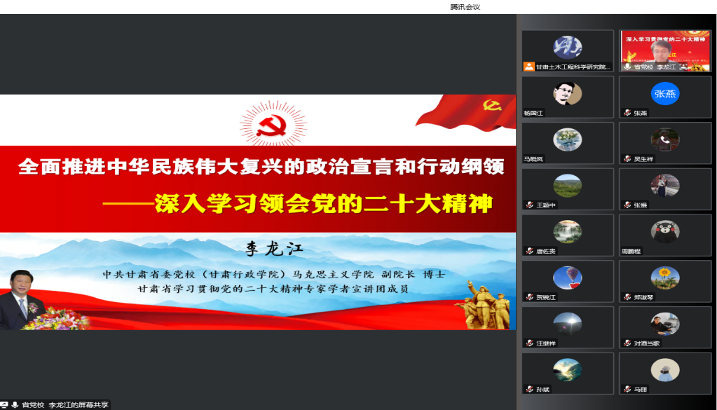 12月14日,甘肅土木工程科學(xué)研究院有限公司以視頻會(huì)議形式召開(kāi)黨委理論學(xué)習(xí)中心組學(xué)習(xí)(擴(kuò)大)會(huì)議暨黨的二十大精神專題培訓(xùn)輔導(dǎo)講座。黨委副書(shū)記、監(jiān)事會(huì)主席、工會(huì)主席張磊主持會(huì)議,領(lǐng)導(dǎo)班子成員、全體黨員、中層干部、入黨積極分子參加。