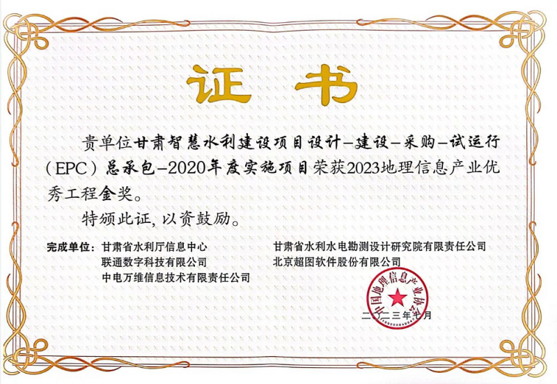 近日,第一屆中國測繪地理信息大會在浙江召開。由省水利廳實施、省水電設計院參與完成的“甘肅智慧水利建設項目設計-建設-采購-試運行(EPC)總承包-2020年度實施項目”榮獲2023中國地理信息產業優秀工程金獎。