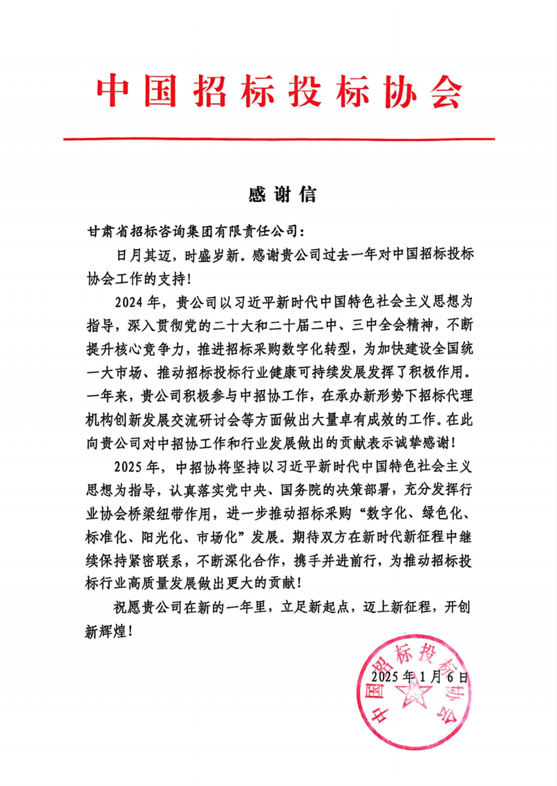 近日,省招標(biāo)集團(tuán)收到來自中國招標(biāo)投標(biāo)協(xié)會(huì)(下稱“中招協(xié)”)的感謝信,感謝省招標(biāo)集團(tuán)作為中招協(xié)常務(wù)理事單位為招標(biāo)投標(biāo)行業(yè)發(fā)展作出的積極貢獻(xiàn)。