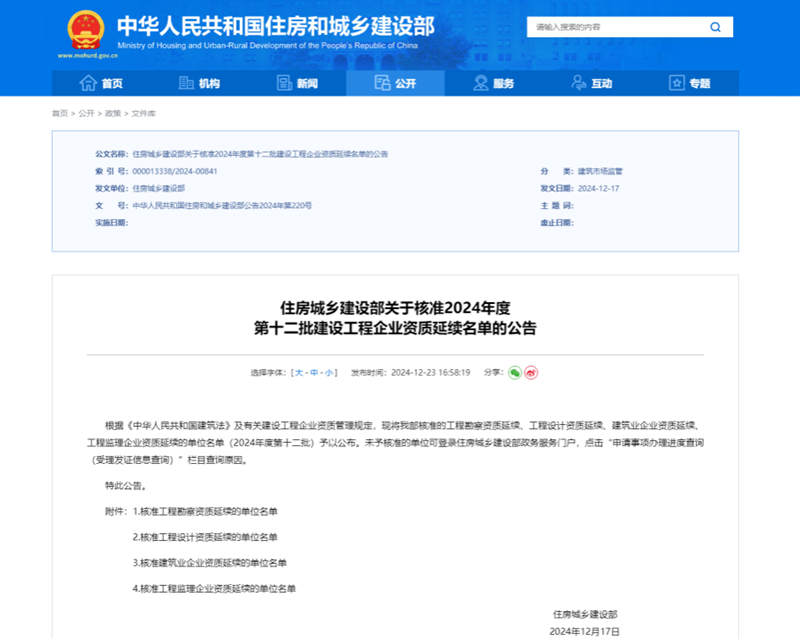 近日,住房城鄉(xiāng)建設(shè)部正式發(fā)布了《關(guān)于核準2024年度第十二批建設(shè)工程企業(yè)資質(zhì)延續(xù)名單的公告》。省建筑設(shè)計院建筑行業(yè)甲級、風景園林工程設(shè)計專項甲級、市政行業(yè)(給水工程)專業(yè)甲級、市政行業(yè)(熱力工程)專業(yè)甲級資質(zhì)通過核準延續(xù)。