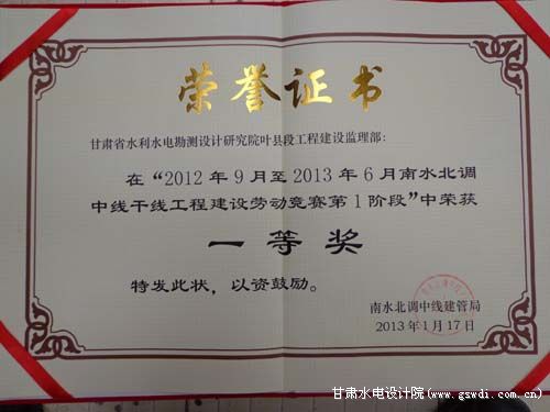 南水北調中線干線工程建設勞動競賽一等獎